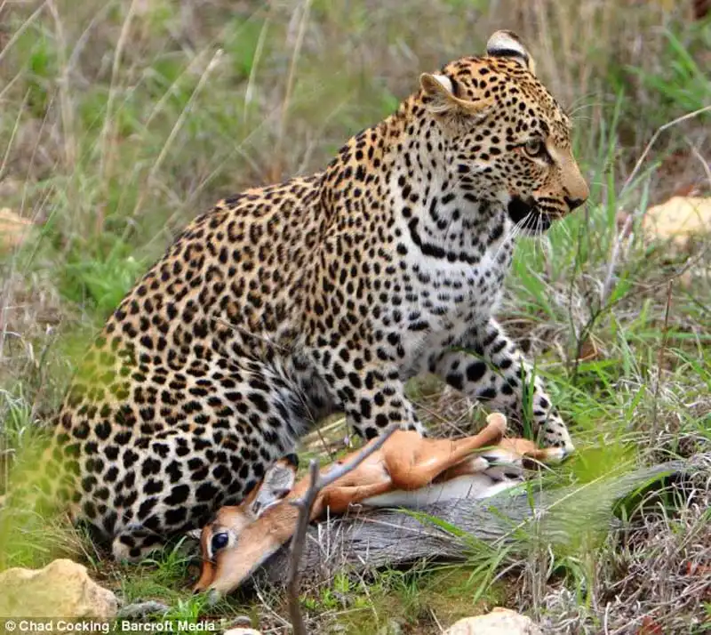 Она, похоже, забавлялась со своей добычей. Положив ее на землю, самка леопарда спокойно ждала, когда к импале вернутся силы, и она попробует сбежать.
