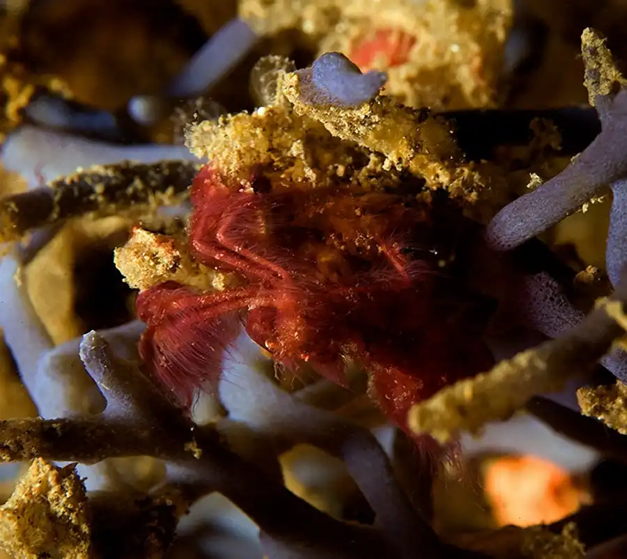 Это существо больше похоже на клок рыжих волос, но на самом деле — это краб с красноватой шерстью. Волоски используются для сбора планктона — основного источника пищи. Когда крабы теряют волоски (такое происходит с возрастом), на клешнях остаются фолликулы, помогающие выживать и идеально подходящие для поиска еды.