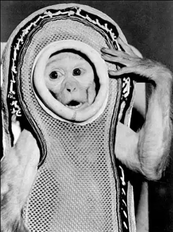 28 мая 1959 года, макака Эйбл (вверху) и беличья обезьяна Бейкер были запущены на 480 километров над поверхностью Земли на борту ракеты Американский Юпитер. Из их комнаты в носовом отсеке они благополучно вернулись на Землю, однако Эйбл скончалась вследствие введения анестезии через несколько дней, когда врачи пытались снять электрод. Она последовала по стопам Альберта, макаки, который в 1949 году стал первым животным в космосе, отправившимся на борту V-2 на 135 километров, но умер при столкновении с Землей.