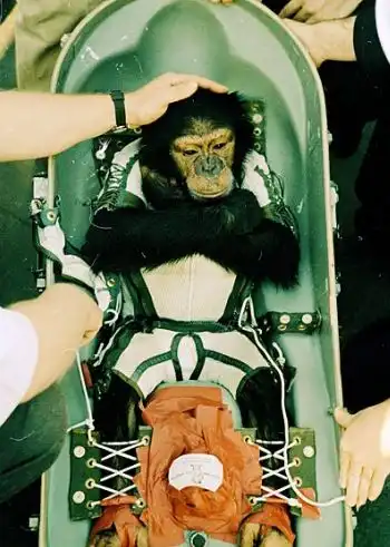 Через одиннадцать дней после того, как Джон Кеннеди стал первым католиком в Белом доме, НАСА сделали Хэма первым шимпанзе в космосе. В отличие от Кеннеди, Хэм не был коренным американцем, он родом из Западной Африки. Несмотря на то, что полет был совершен на 68 км выше и 2400 километров в час быстрее, чем предполагалось, Хэм перенес его хорошо, испытывая лишь небольшое обезвоживание и усталость. На этом фото он отдыхает на борту спасательного судна после того, как был вытащен из Атлантического океана.