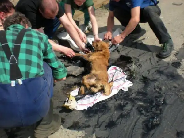 Из-за сильной жары, в Пётркув-Трыбунальский (Польша) начал плавиться асфальт и собакен угодила в эту ловушку на дороге.