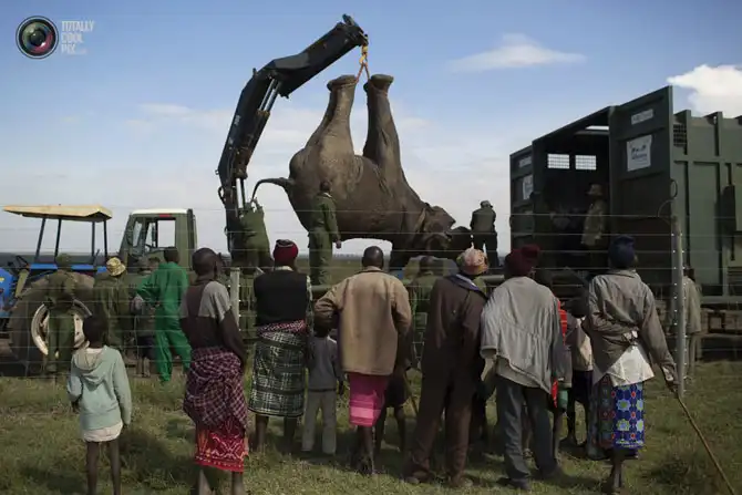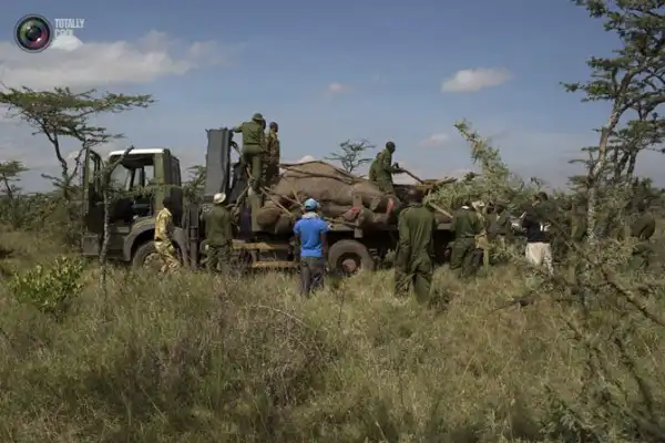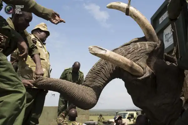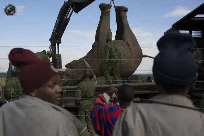 Работники Службы охраны дикой природы Кении помещают усыплённого снотворным слона в кузов грузовика в рамках подготовки к предстоящему переселению десяти слонов, которые посягают на общинные земли, в заповеднике Ol Pejeta в центральной Кении.