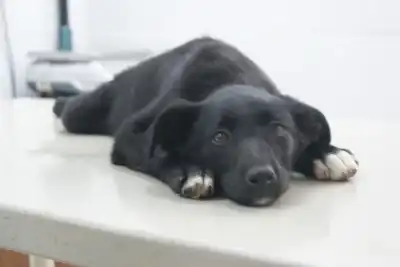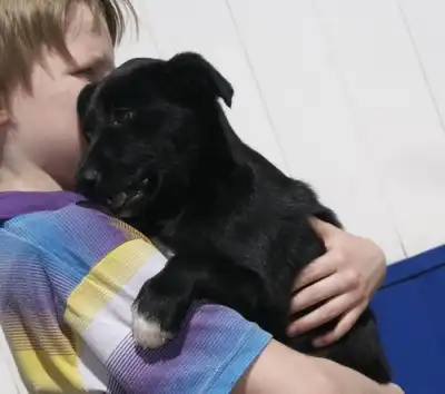 Дети нашли щенка, которого зажало под плитами. Итог - временный парез конечности, на фото одну лапку держит вытянутой. Чувствительность есть, мочеиспускание итд - не нарушено. Это - девочка, 3-3,5 мес. Вырастет выше колена. Придет в себя обязательно, проходит курс уколов и витаминов. Спасшие малышку люди - не могут оставить её себе насовсем.