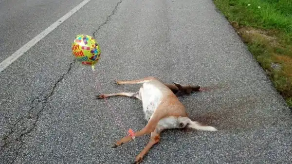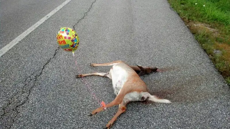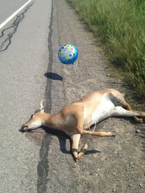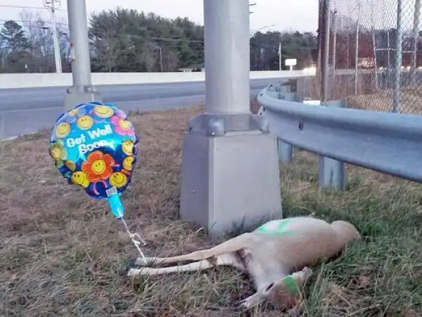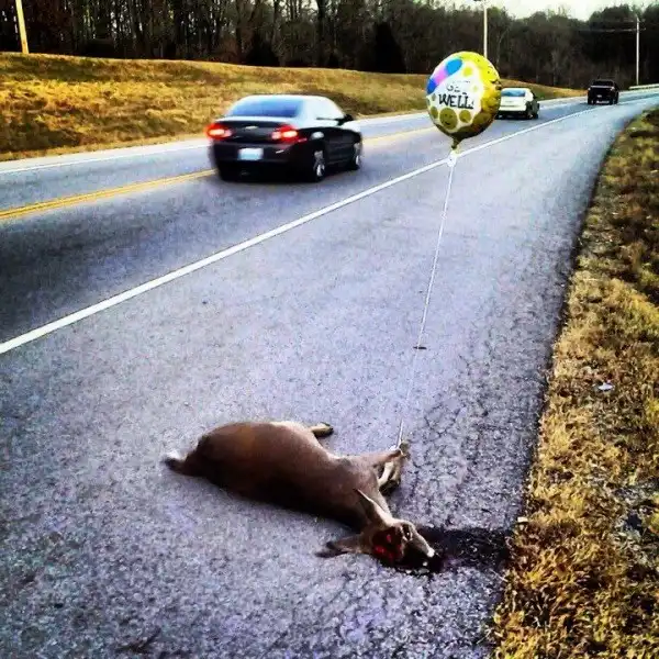 Среди американцев появилась новая приблуда, которая меня лично повеселила, но может возмутить любителей животных. В общем, мужики находят трупы сбитых на дороге оленей и цепляют к ним шарики с надписью "Поправляйся скорее". Под раздачу уже даже попал один голубь. Жесть, конечно, но ржачно.
