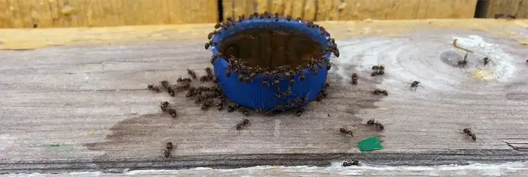 Заметьте, что на время начала эксперимента, газировка налита в крышку даже немного через верх, но благодаря поверхностному натяжению не выливается на специальную площадку для экспериментов (скамейка на даче). Начавшаяся вечеринка начала набирать обороты и через полчаса муравьи прилично напились.