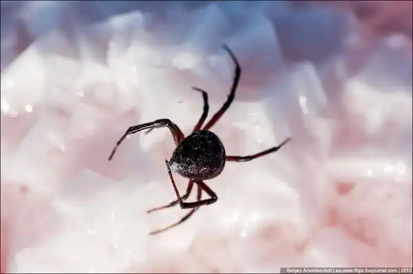 На фотографиях каракурты, найденные на берегу Кояшского соленого озера, в том числе занесенные ветром на соляные кристаллы, где они и позировали для этого поста