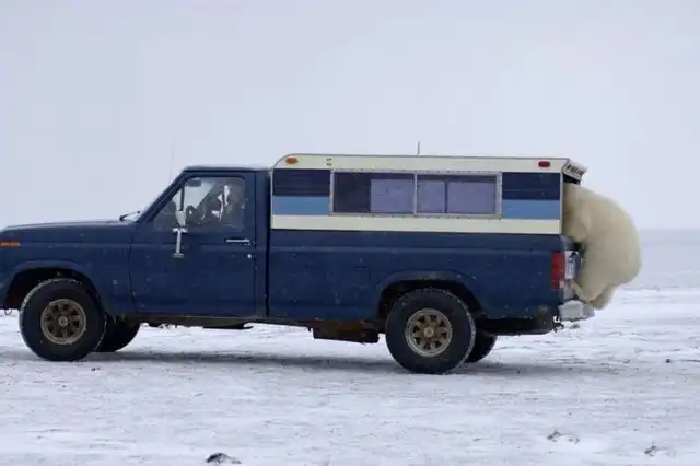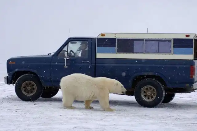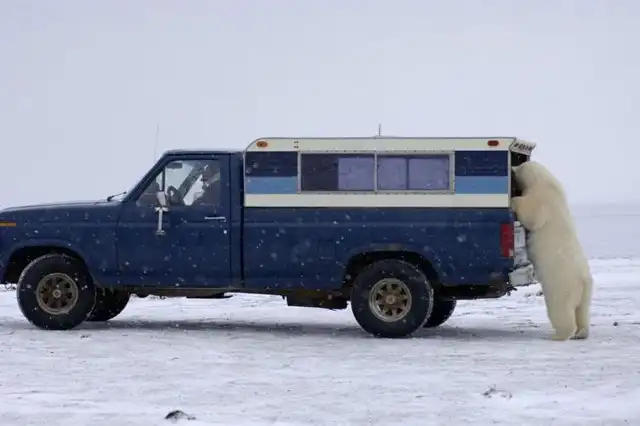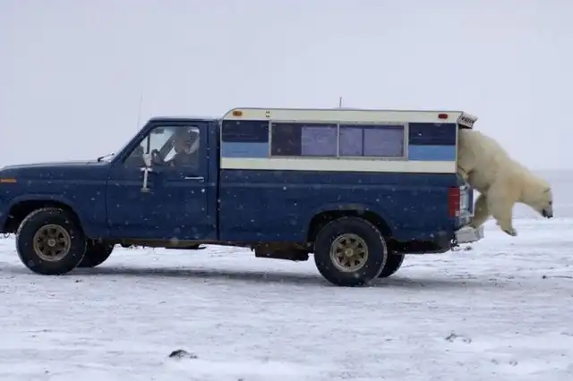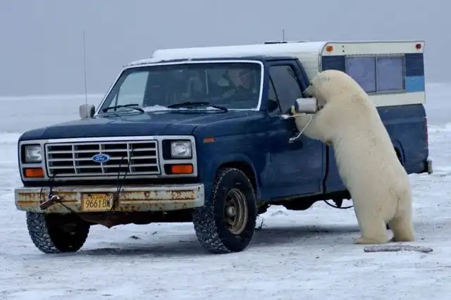 Наверное, "мишка" просто очень замерз, поэтому он долго просился в салон пикапа, внутри которого в тепле и комфорте сидел не на шутку перепуганный фотограф )) Думаю, после такой встречи с белым медведем, фотографу точно придется менять свои штаны ;)