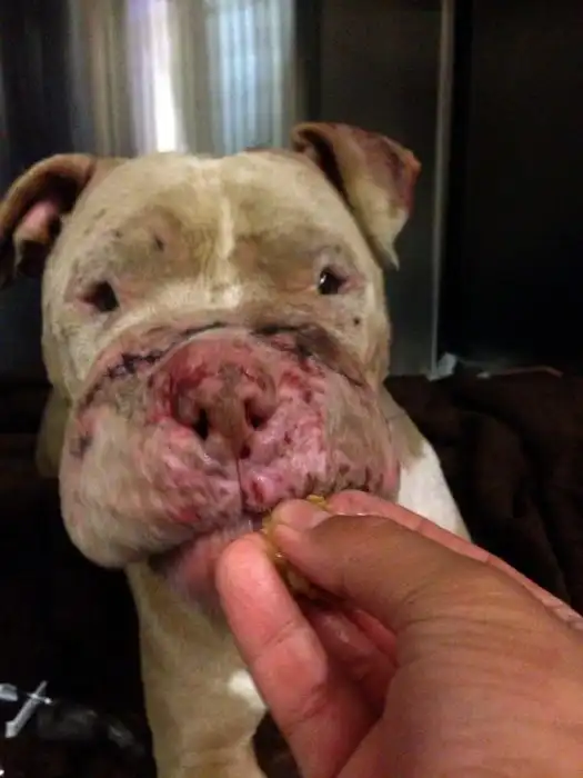 За ней, не ухаживали хозяева. И она питалась на мусорниках, где пострадала в боях с бродячими собаками и енотами.