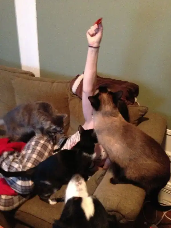Кошки же ненавидят, когда вы их тискаете. Ее взгляд так и говорит: «Отпусти меня, коза».