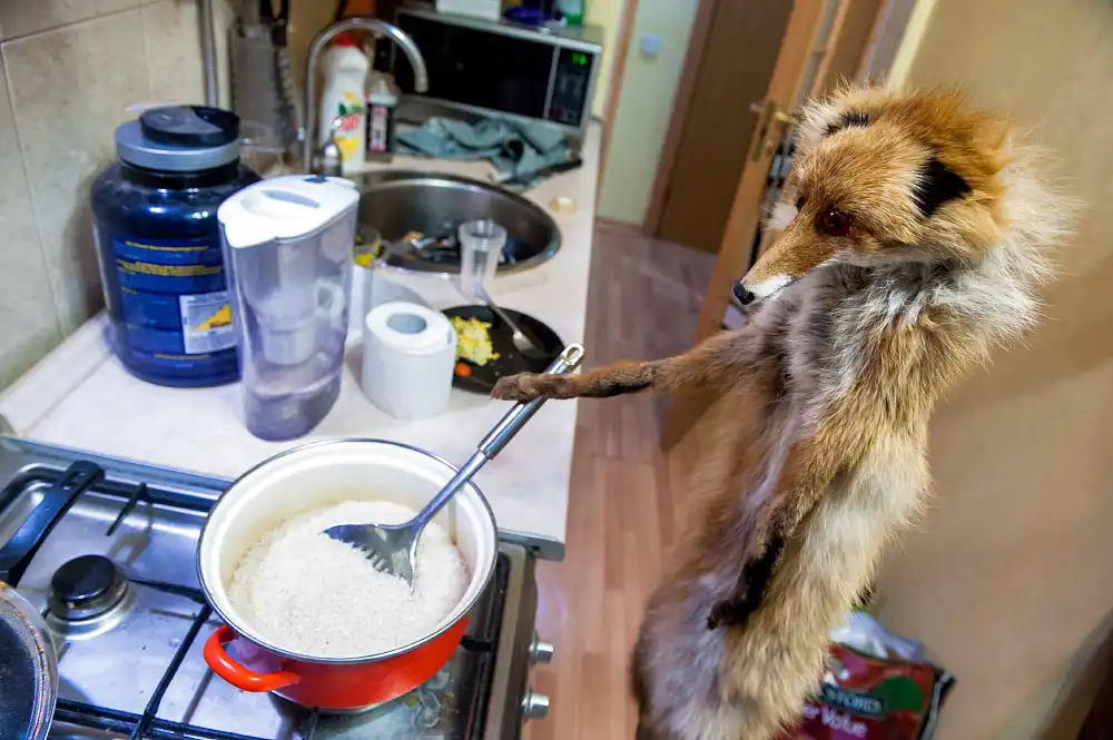 Наступает время завтрака. Лис очень любит каши и всегда готовит рисовую кашу по-утрам.