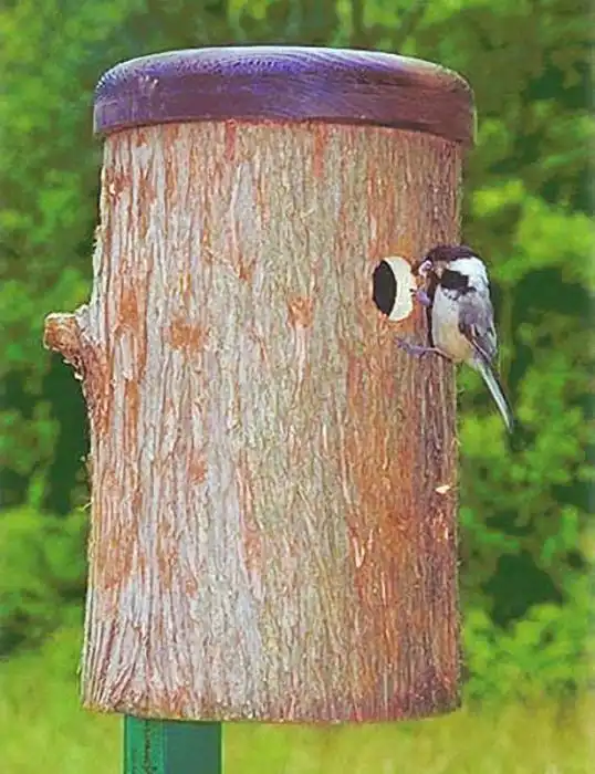 Если хотите, чтобы у вас в саду летом поселились синицы, можно осенью развесить кормушки, а также дуплянки (как на фото), в которых птицы будут ночевать в холода. Домики из досок, типа скворечников, синицы недолюбливают. Привыкнув же за зиму к дуплянкам, они охотно поселятся в них летом.