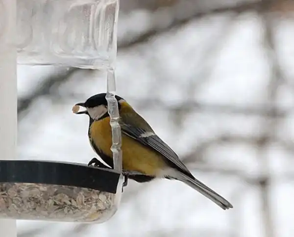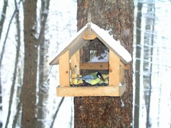 Итак, в холодное время на согрев маленького пернатого существа необходима энергия, которую птицы берут из пищи. Желающие помочь птицам легко могут смастерить кормушку, найти «стройматериалы» для которой проще простого – достаточно взять коробку из под сока или молока, вырезать в ней отверстие и повесить около дома.