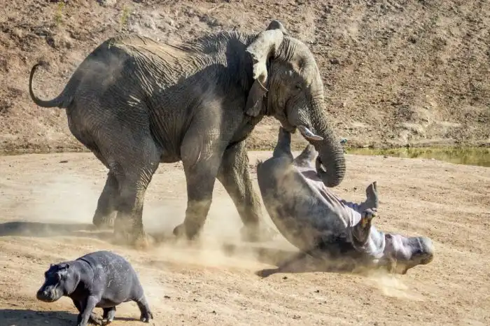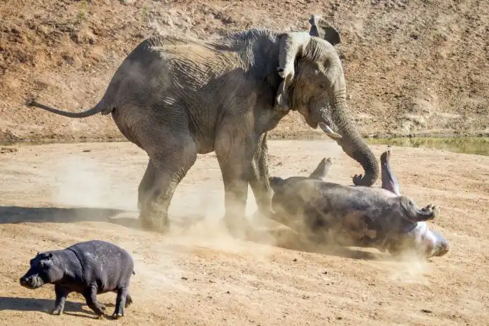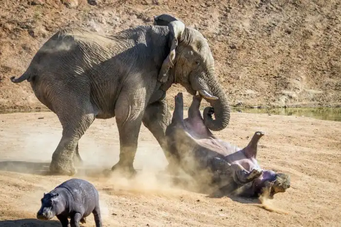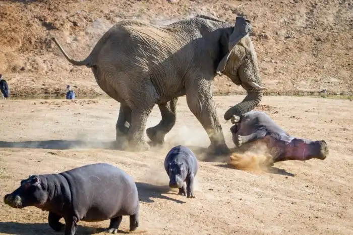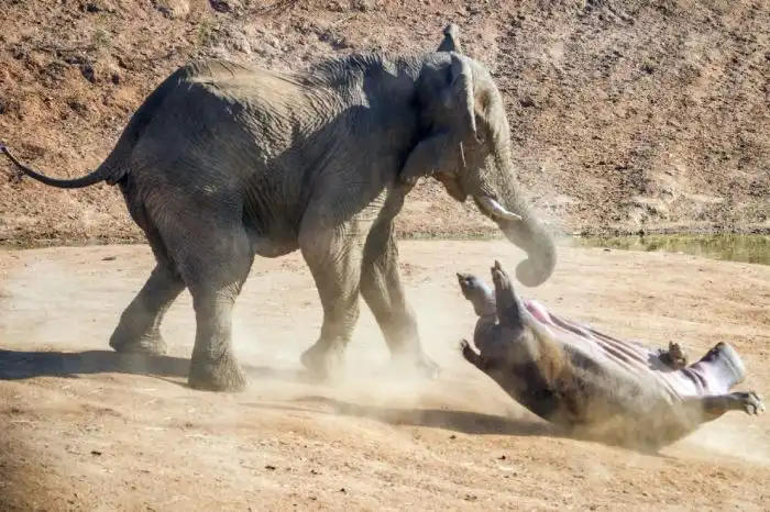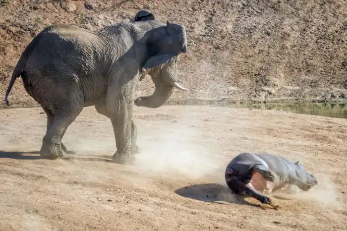 На днях я рассказывал вам, о коварной ловушке для слона, которую устроил хищник на водопое, а сегодня вы увидите, как разбушевавшийся слон сошелся в схватке с не менее грозным гигантом - бегемотом.