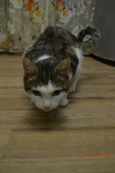 Кот Трой - окрас табби биколор (верх полосатый, низ белый), крупный красивый молодой кот, ему примерно 1 год. Кота принесли пристраивать на ярмарку и не забрали. Кот милый, ласковый, приятный в общении, очень смышленый и сообразительный, хорошо ладит с другими животными (кошками и собакой). Пользуется лотком, питается готовыми кормами. Кастрирован. А еще у него необычная симпатичная белая кисточка на хвостике.