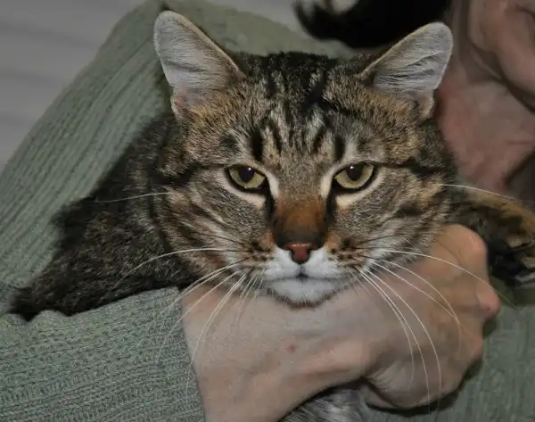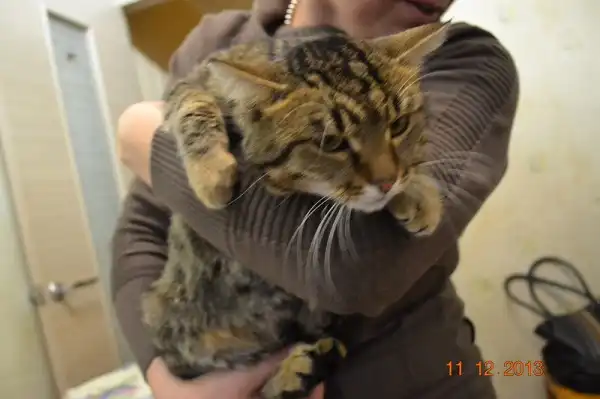 Кеша - большой добрый полосатый кот с зелеными глазами, долго жил в подъезде на Каштаке, откуда его периодически выгоняли. Кот робкий и интеллигентный, спокойный, людей до сих пор побаивается, как и других кошачьих. Очень яркий полосатый окрас, на спине необычные разводы, можно даже сказать мраморные. К сожалению, на фото получился плоховато, боялся. Питается готовыми кормами, пользуется лотком. Кастрирован.