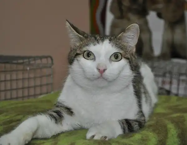 Кот Трой - окрас табби биколор (верх полосатый, низ белый), крупный красивый молодой кот, ему примерно 1 год. Кота принесли пристраивать на ярмарку и не забрали. Кот милый, ласковый, приятный в общении, очень смышленый и сообразительный, хорошо ладит с другими животными (кошками и собакой). Пользуется лотком, питается готовыми кормами. Кастрирован. А еще у него необычная симпатичная белая кисточка на хвостике.