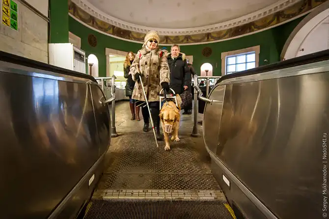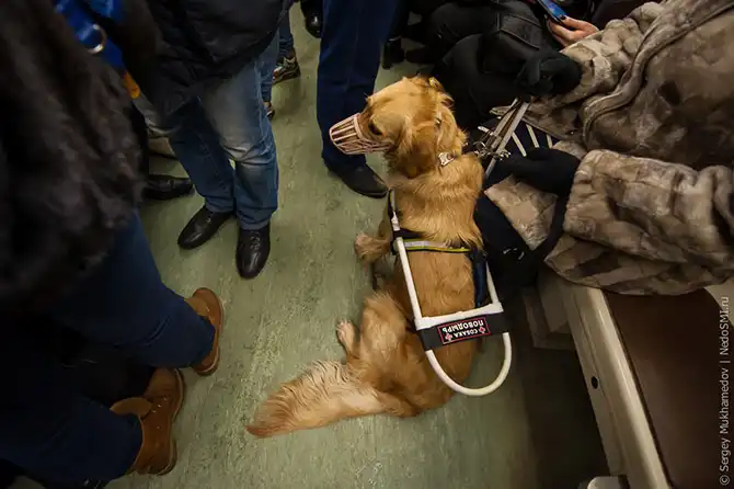 По российскому законодательству, собаки-поводыри бесплатно ездят любым видом общественного транспорта, в поездах, на пароходах и в пассажирских отделениях самолетов.