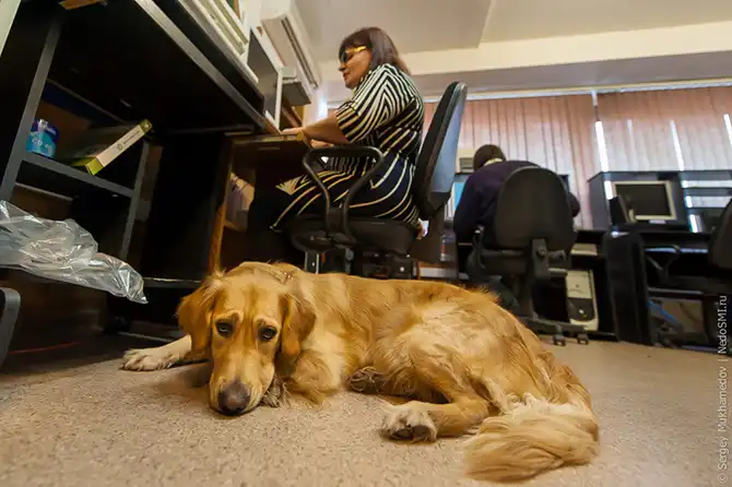 Простите, отвлекся. Возвращаемся к нашим собакам. Чтобы поразиться работой собаки-поводыря, мне даже не нужно было «влезать в шкуру» незрячего и экспериментировать на себе. Достаточно посмотреть со стороны, проведя часть дня с Оксаной – владелицей замечательной Герды из центра «Собак-помощников инвалидов». На работе это очаровательная милашка – любимица всех сотрудников.