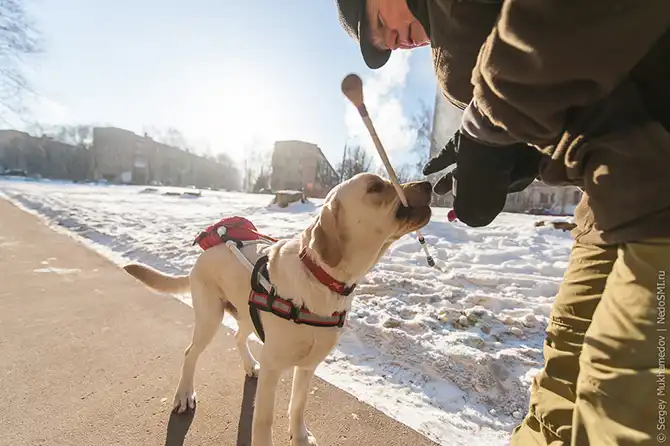 Обучение поводырей занимает шесть-восемь месяцев. В общей сложности на ее воспитание до сдачи экзамена уходит год. Часть собак за время учебы отсеивается, Центр их пристраивает в хорошие руки.