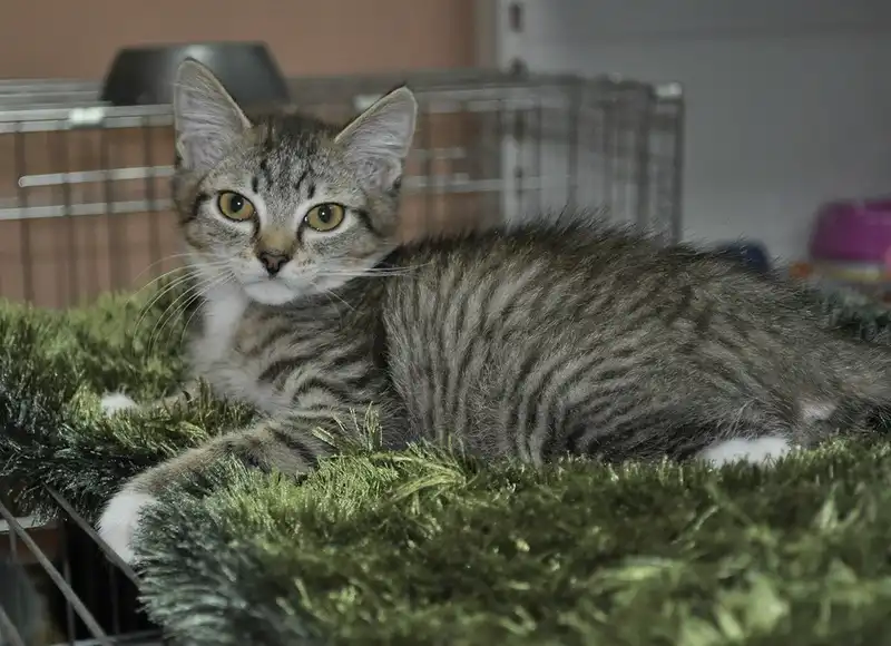 Вот такое маленькое полосатое создание было выброшено в павильоне центрального рынка. Котенок мальчик, примерно 2,5 мес. Робкий, ненавязчивый малыш. Лотком пользуется, питается влажными и сухими кормами для котят. Прошел необходимые гигиенические процедуры. Имеет сертификат на скидку при кастрации.