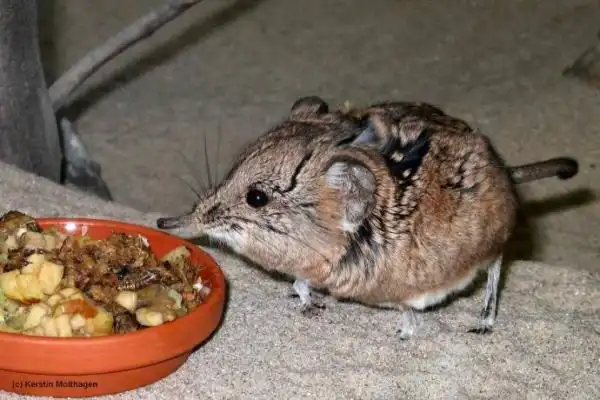 Нос у зверька довольно сильно вытянут и напоминает хобот, за что попрыгунчик и был назван слоновым. А почему, собственно, прыгунчик? Тут все очень просто. Это местное название, придуманное аборигенами задолго до появления бледнолицых зоологов. Дело в том, что задние лапки зверька намного длиннее передних и когда ему угрожает опасность, он встает на эти лапки и запросто упрыгивает куда подальше, как миниатюрный кенгуру.