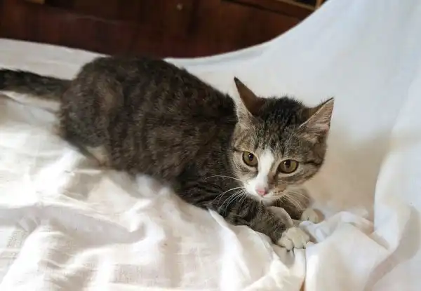 Лариска - маленькая полосатая кошечка с белым носиком. Ей примерно 10 мес. Милый, ласковый ребенок, очень охотно идет на контакт с людьми. Жила в большом кошачье-собачьем коллективе, хорошо уживается с другими животными. Питаться может как готовыми кормами, так и натуральными. Лотком пользуется. Стерилизована.