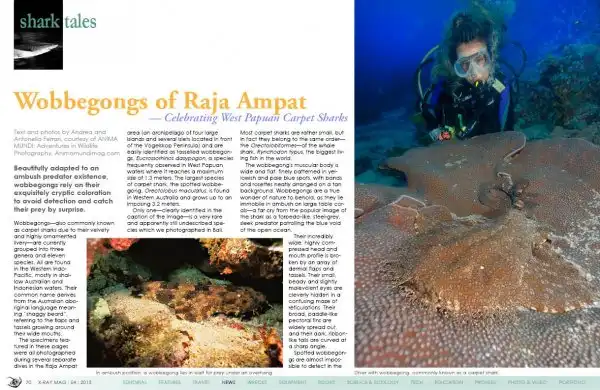 Wobbegong означает на языке австралийских аборигенов “лохматая борода” и действительно, на морде у этой акулы смешные усы, борода и бакенбарды. Окраска пятнистая, защитная, позволяющая оставаться незаметными, когда они находятся “в засаде”. Грудной плавник больше похож на широкую “лапу”. Если присмотреться внимательно, рисунок на спине и плавниках образует сентиментальные “ромашки”. )