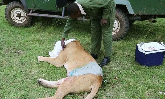 11-летняя львица получила серьезное ранение во время схватки с буйволом в заповеднике Кении. К счастью, смотрители заповедника вовремя заметили жуткую рваную рану на ее теле и тотчас же вызвали бригаду ветеринаров.