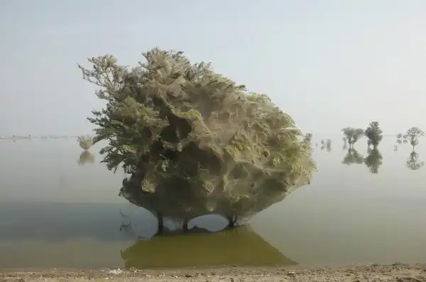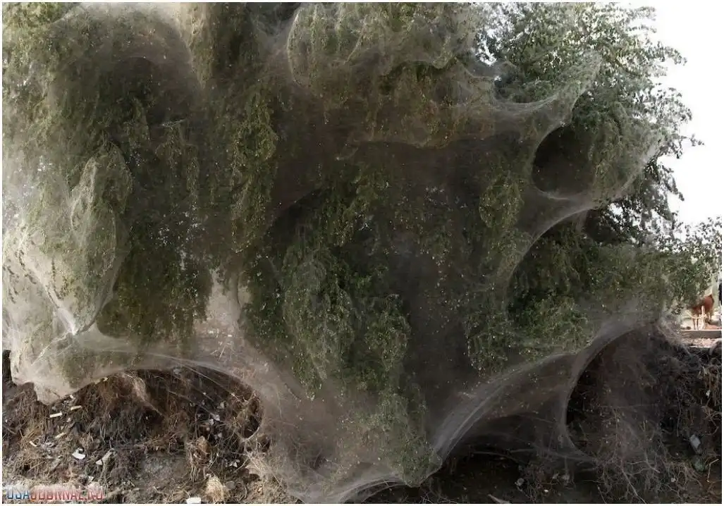 Еще в 2011 году в Пакистане произошло массовое нашествие пауков, благодаря которым можно наблюдать невиданное зрелище: они так густо покрыли придорожные деревья своей паутиной, что их еле видно под скопищем тончайших нитей.