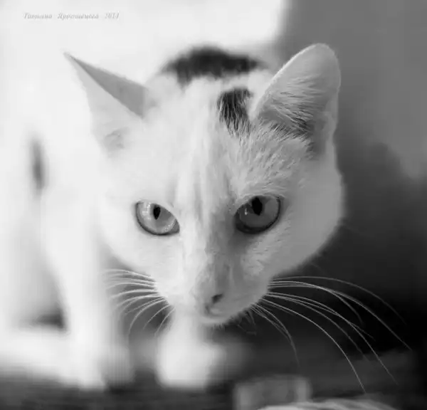 Шарлотта - кошка окраса арлекин (белая с черными пятнышками) с желтыми глазами, небольших размеров. Тельце длинненькое, немного напоминает ориентальных кошек, также немного вытянут носик. По характеру также независимая, индивидуалистка, хотя хорошо уживается с другими кошачьими, но постоянно держится особняком. Человеку позволяет взять себя на руки, но особо удовольствия не испытывает, когда ее отпускаешь, уходит без сожаления. Кошечка была найдена зимой в холодном подъезде с котенком. Пользуется лотком, питается готовыми кормами. Стерилизована. Подойдет для людей, у которых нет много времени на животное.