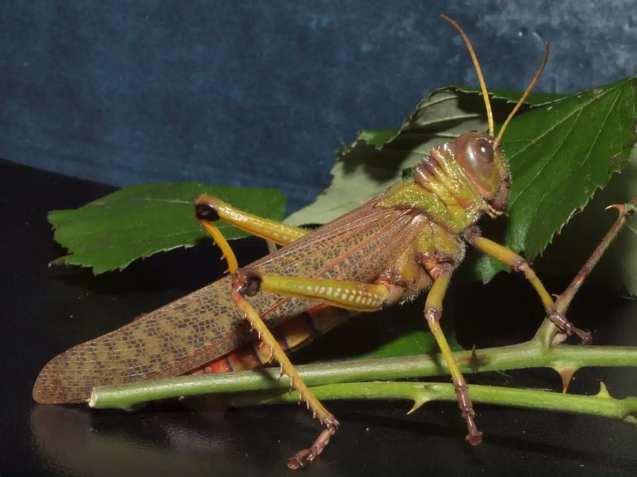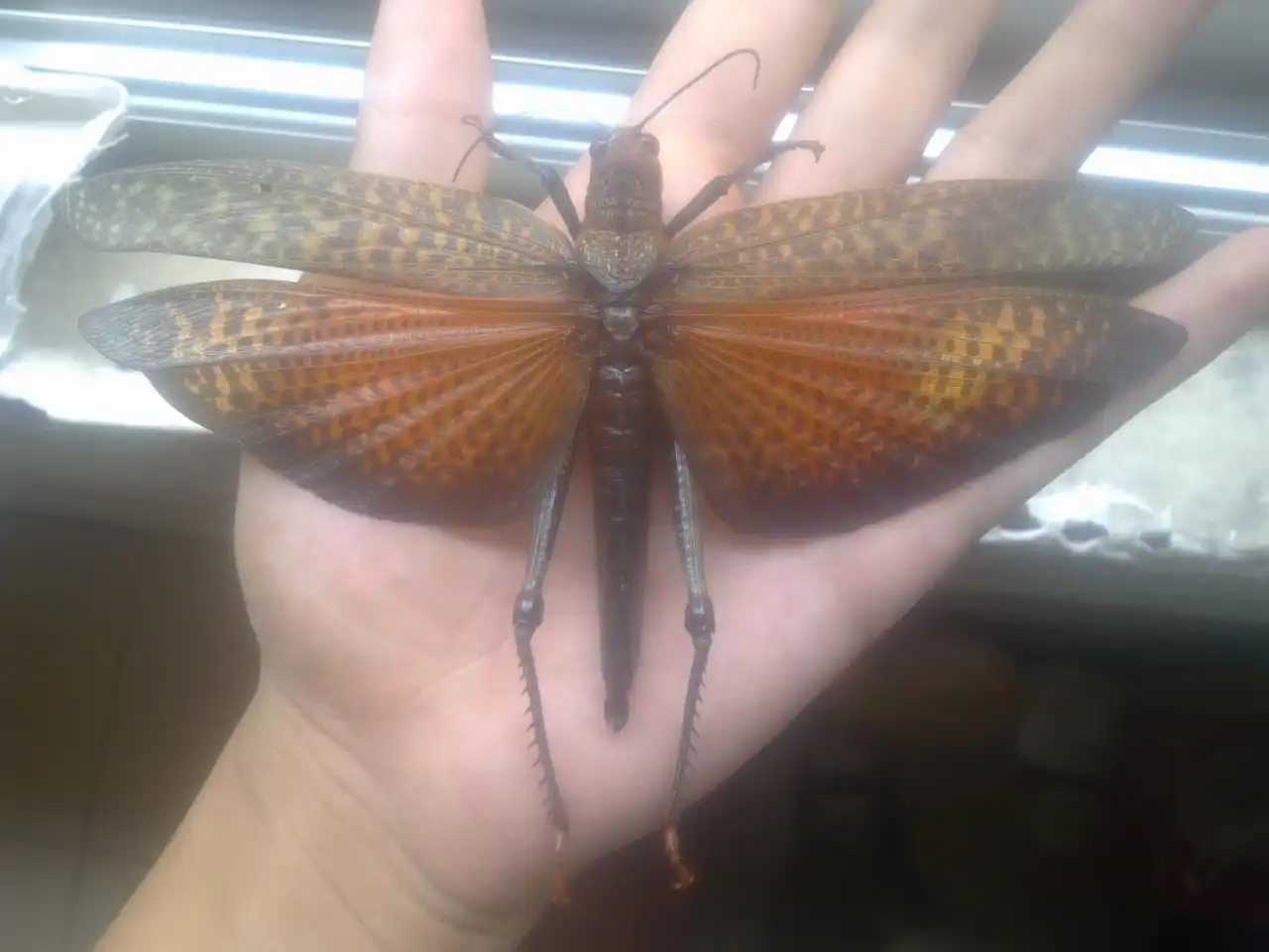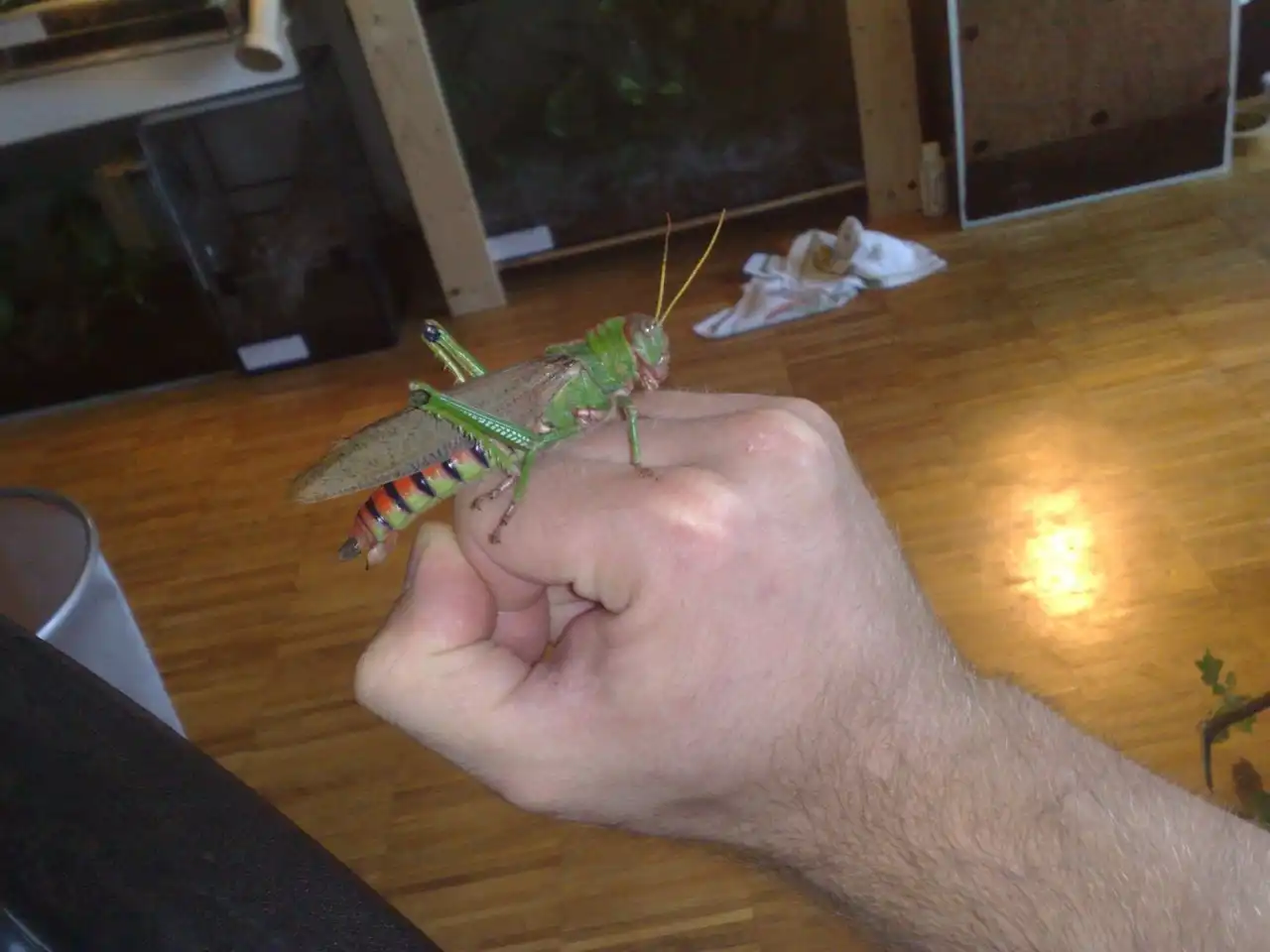 - Этот мобильник для меня слишком мал! – сказала саранча и отвернулась… / Гигантский конёк Tropidacris collaris, семейство саранчовые, родина – Тринидад (Центральная Америка) / выставка живых насекомых на биофаке МГУ