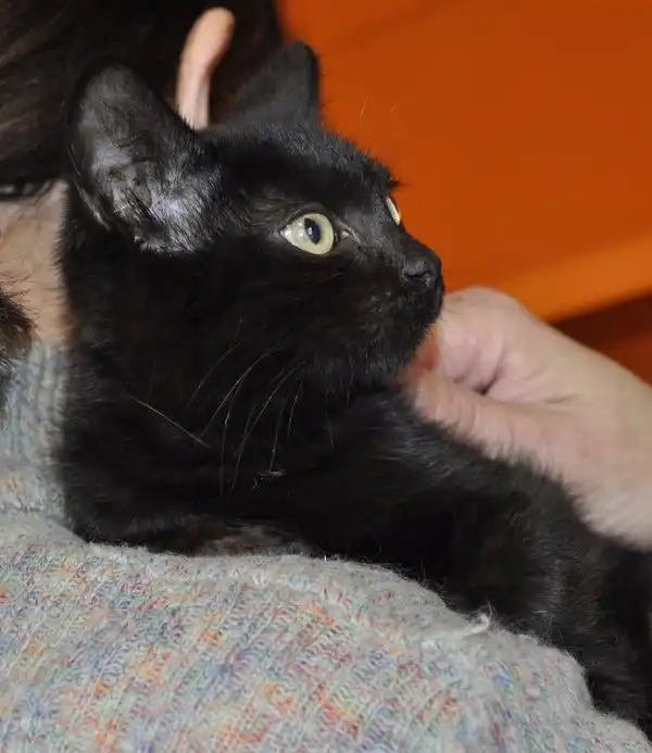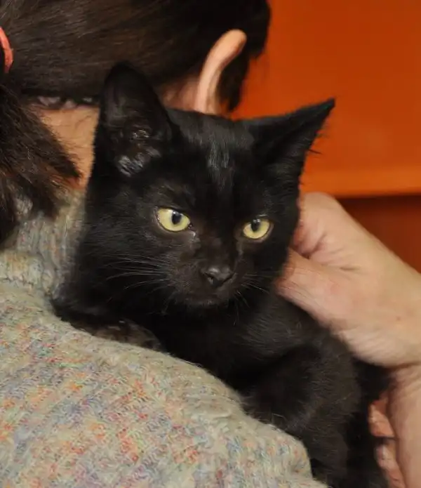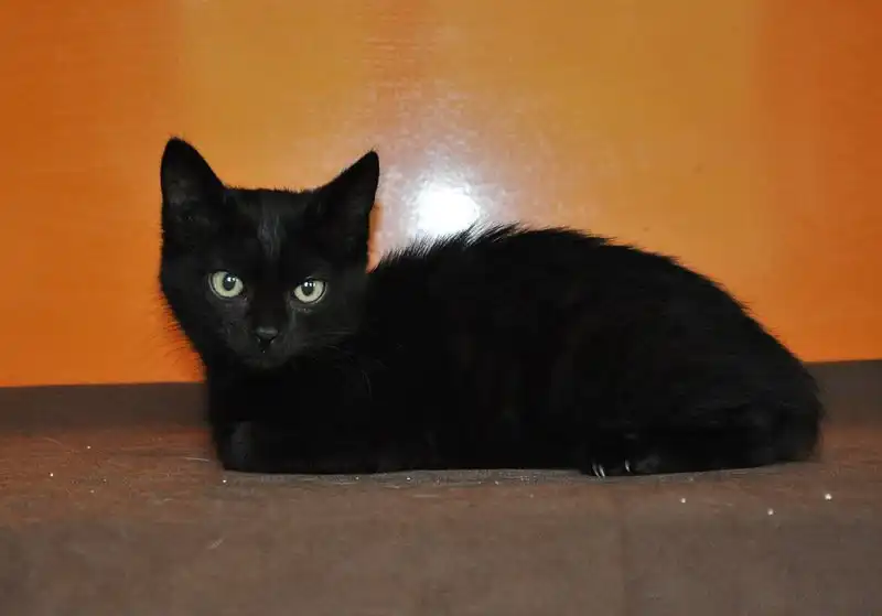 Совершенно черный котенок, девочка, возраст примерно 2,5 мес. На боках черные и шоколадные полоски. Ребенок контактный, очень любит ласку и внимание, но ненавязчивая, спокойная. Питается сухим и влажным кормом для котят, лотком пользуется. Имеет сертификат на скидку при стерилизации.