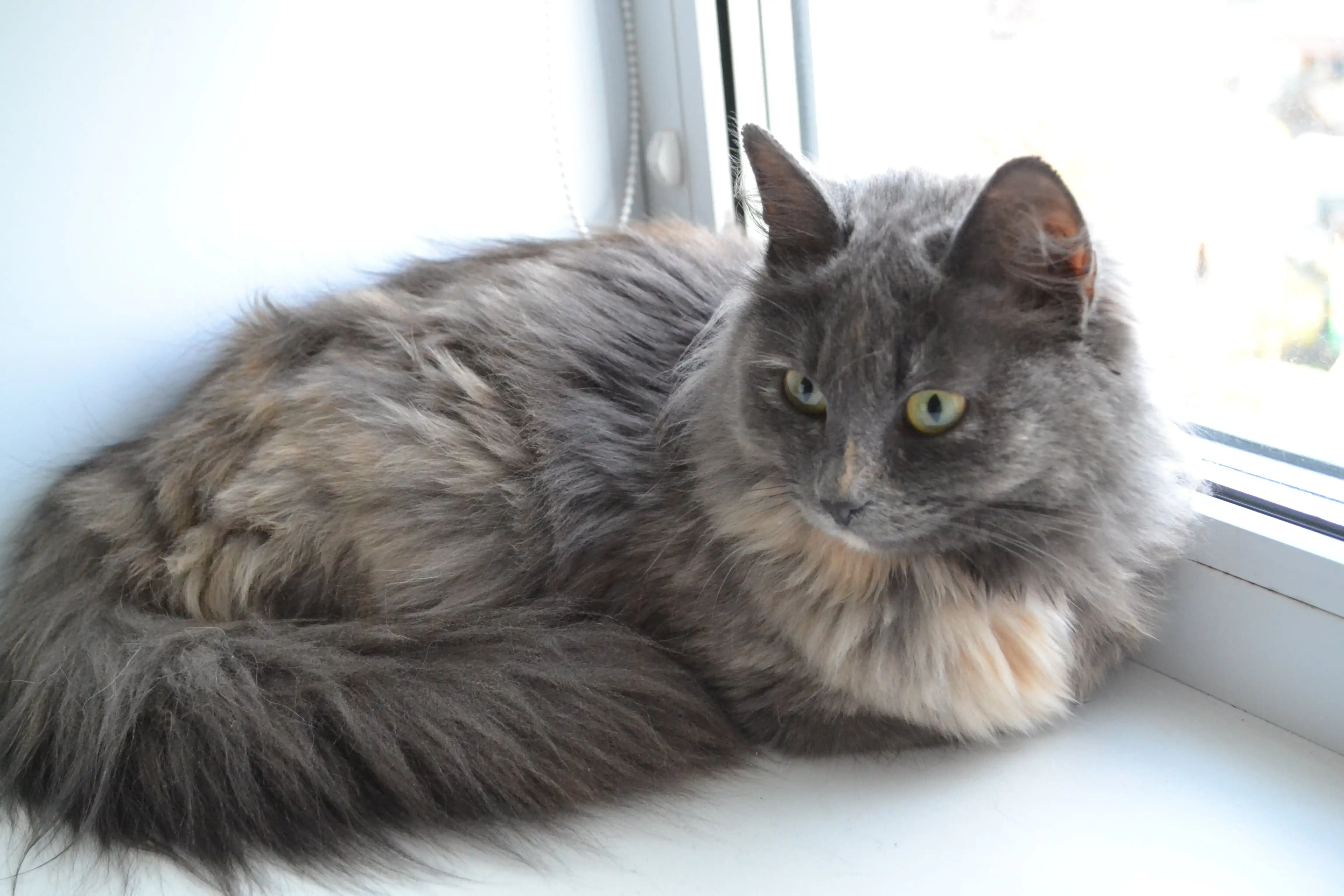 Кошка очень красивая: мягкая пушистая шерстка черепаховой расцветки, глазки с зеленоватым отливом.