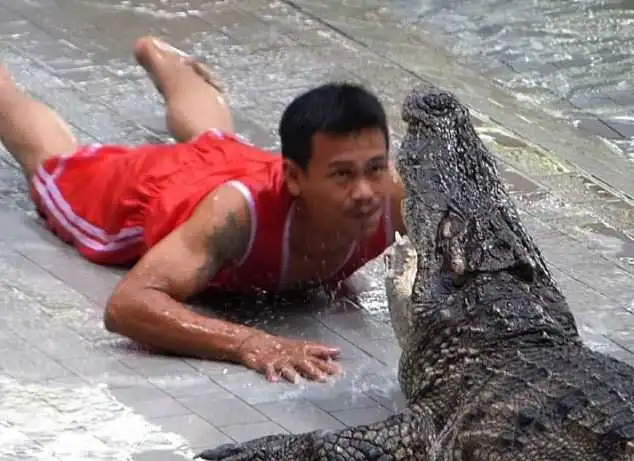 Один из трюков заключается в том, что мужчина, хорошо разогнавшись, подъезжает на животе к аллигатору и целует его в кончик носа, при этом, даже не дрогнув. Не мене бесшабашным является и номер женщины, которая погружает крокодила в транс с помощью бамбуковой палки, а затем осторожно помещает свою голову между усеянных острыми зубами челюстей.