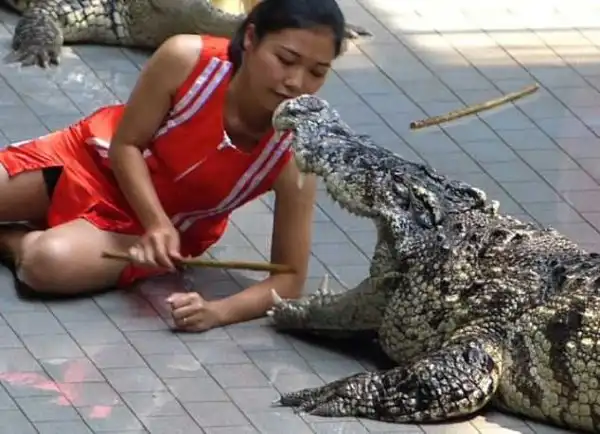 Столь необычное шоу для гостей зоопарка в Паттайя выполняют два дрессировщика. Номера, которые мужчина и женщина исполняют во время своего представления с крокодилами заставляют зрителей жмуриться и кричать от страха.