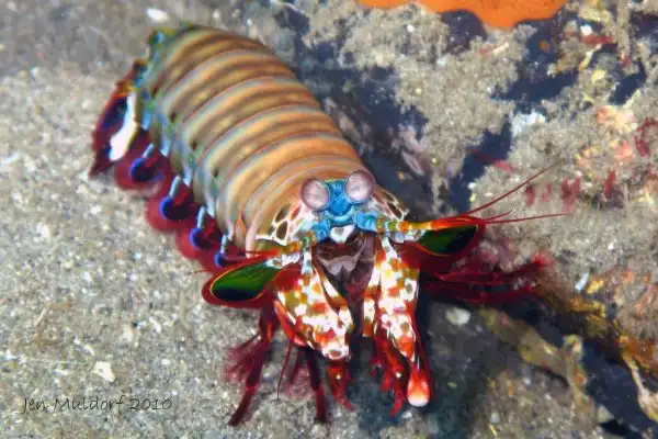 Рак — богомол (Odontodactylus scyllarus), также известный, как креветка богомола арлекин, или Креветка — богомол Павлиновая — относится к отряду ракообразных.