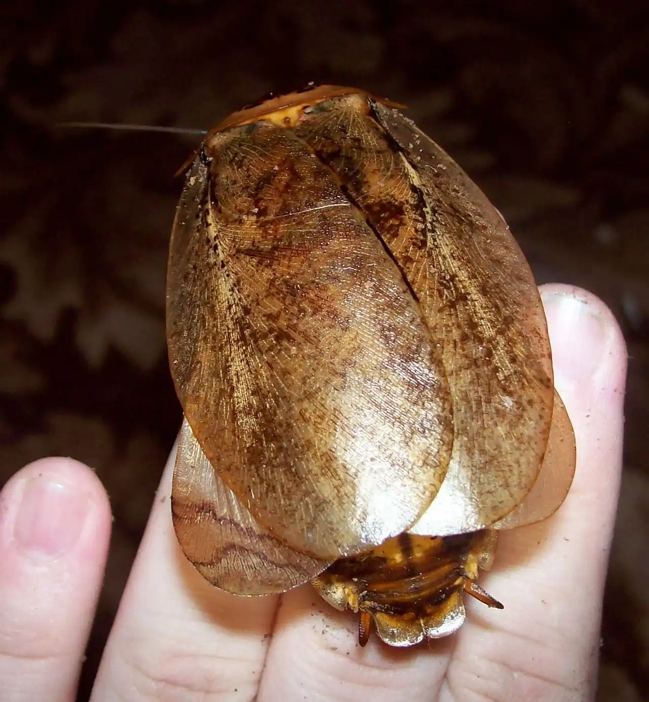 На самом деле эти тараканы очень интересны и отлично подходят для тех, кто не просто любит смотреть на питомца через стекло, но и потискать любимого таракана. По поведению таракан очень спокоен, передвигается достаточно медленно, в порыве испуга может делать короткие рывки на дистанцию около 10-20 см, затем успокаивается и возвращается в свой спокойный темп, что особенно радует, т.к. не приходится гоняться за ним по всей комнате, если ему вздумается удрать. Достаточно скрытный, личинок увидеть на поверхности можно только ночью, днём они закапываются в субстрат. Взрослые особи также большую часть дня, как правило, проводят в субстрате, выходя в основном вечером-ночью в поисках еды. Не ползает по стеклу, не воняет при обычных условиях, исключение — испуг, тогда он, чтобы отпугнуть обидчика, испускает не интенсивный немного резковатый запах, что-то среднее между запахом перца «Чили» и нафталином. Тараканы во истину сладкоежки, никогда не откажутся от винограда, бананов и сладкого мандарина, позволяя кормить себя с рук. Один небольшой минус, личинки сидя на руках могут грызть кожу, всё не так ужасно как звучит, но всё же неприятно. Сначала он длительно сидит на руках пробуя своими вкусовыми щупами, потом ещё до того как начнёт покусывать он долго шевелит челюстями, затем слегка покусывает, как бы пробуя, а затем, если на него не подуть начинает пожёвывать кожу. Процесс очень медлительный, поэтому предотвратить это «хулиганство» достаточно просто, подув на него. С чем это связано не знаю, т.к. белка в рационе достаточно.