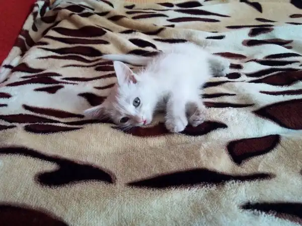 В нашем подъезде сидел белый котенок, это девочка. Зажавшись в уголочек и дрожа от страха и голода. Я забрала ее к себе, но оставить у себя не могу. Я целыми днями на работе, дома практически не бываю, а такую малютку нельзя оставлять одну, поэтому ищу ей заботливого хозяина. Блох нет, учится пользоваться лотком. Очень милая и спокойная.