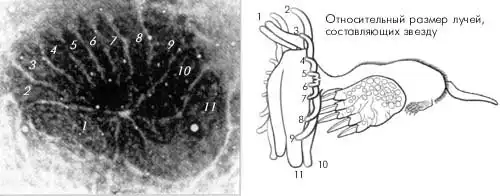 Схема, иллюстрирующая относительное «представительство» разных лучей в анализирующем отделе коры головного мозга звездоноса. Цифры на рисунке соответствуют порядковому номеру пар лучей