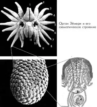 Обследование лучей с помощью сканирующего электронного микроскопа показало, что кожа здесь не просто насыщена тактильными рецепторами – вся звезда целиком, подобно сетчатке глаза, представляет собой единую чувствующую структуру. Поверхность каждого из 22 лучей образована микроскопическими сосочками, носящими название органов Эймери. Каждый из этих органов, в свою очередь, представляет собой комплекс рецепторов, передающих в мозг различные сигналы. В нижней части органа Эймери находится единичное нервное окончание, окруженное кольцевыми пластинками (ламеллами), образованными шванновскими клетками. Эта структура является рецептором, воспринимающим относительно простую информацию о вибрациях или о факте контакта с неким внешним объектом. Выше этого рецептора располагается другое нервное волокно, связанное с так называемыми Меркелевыми клетками (описанными в 1875 г. исследователем Меркелем в эпидермисе мордочки крота), – эта часть органа воспринимает и передает в мозг информацию о давлении на кожу. Наконец, верхушка органа Эймери представляет собой округлое вздутие, составленное рядом расположенных непосредственно под поверхностью кожи нервных окончаний, расходящихся от центра в стороны подобно спицам колеса. Если два нижних типа рецепторов встречаются у многих млекопитающих, то окончание органа Эймери – структура, свойственная только кротам. Она обеспечивает восприятие информации о мельчайших деталях поверхности встреченного объекта.