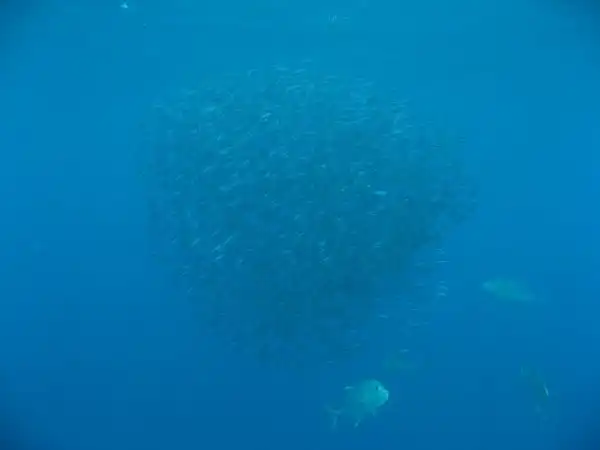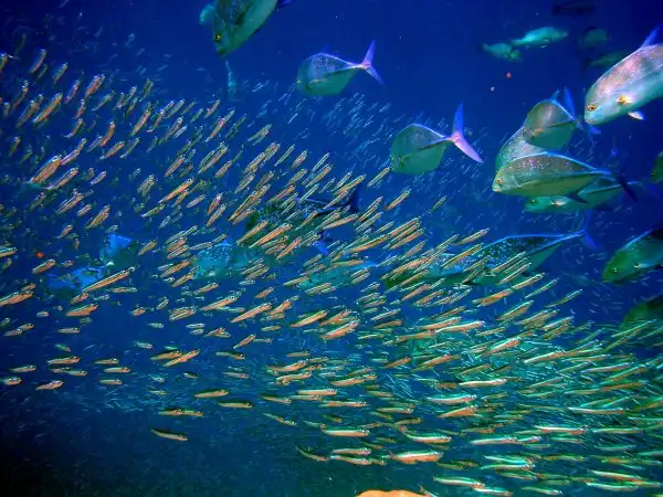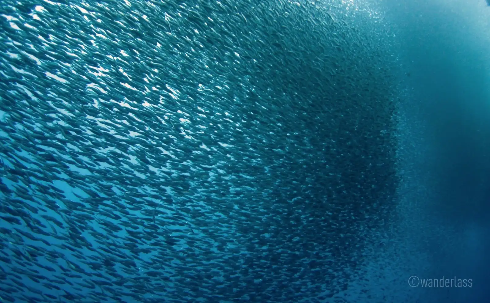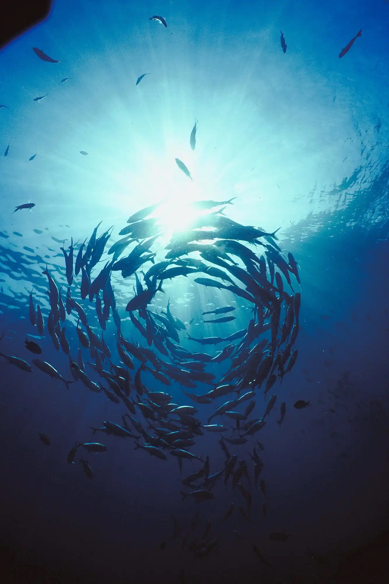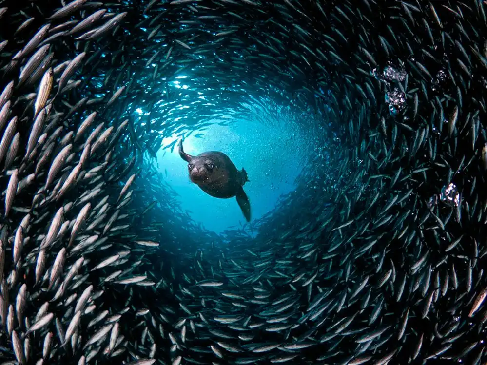 У мексиканского побережья Калифорнии дайвер исследует скопление большеглазых каранксов. Здесь, в морском заповеднике Кабо-Пульмо, тысячи рыб сбиваются в огромный шар для продолжения рода. Автор фото: Octavio Aburto.