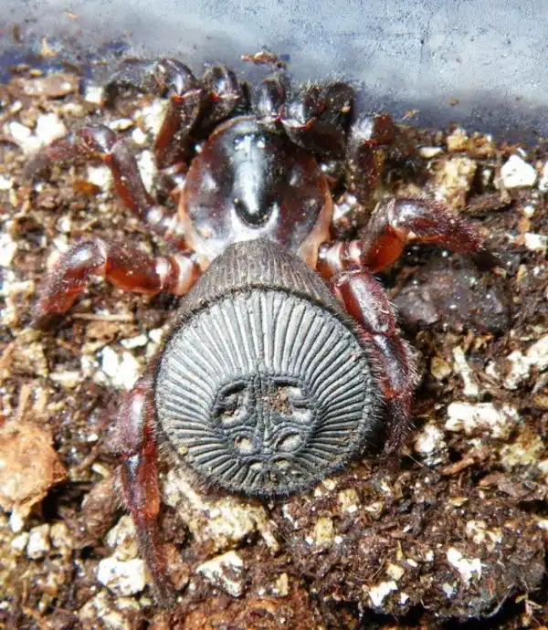 Свой диск паук использует в качестве одного из способов защиты в случаях опасности. Они ведут малоподвижный образ жизни, поэтому от своих норок далеко не отходят. Во время угрозы он уползает в свою норку головой вперед и своим твердым диском закрывает вход в убежище.