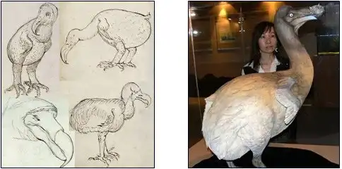 Ранние рисунки додо (слева), реконструкция дронта (справа)