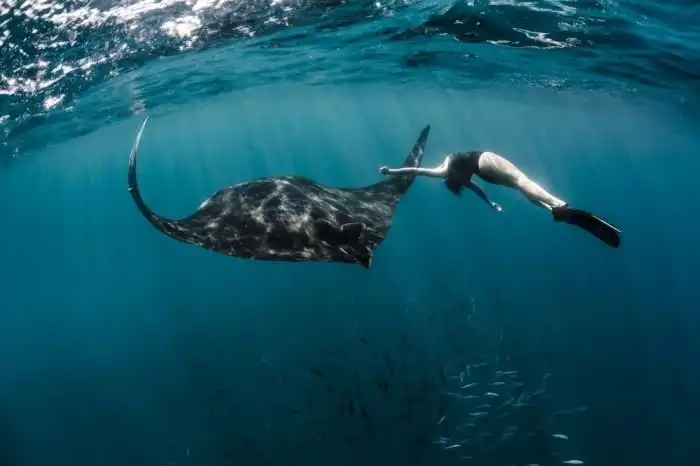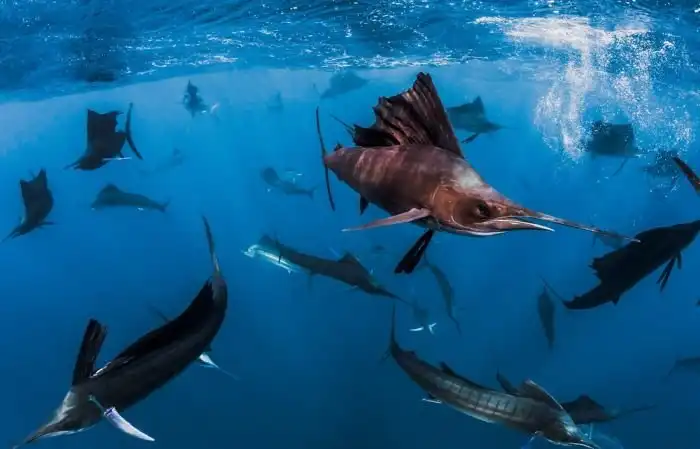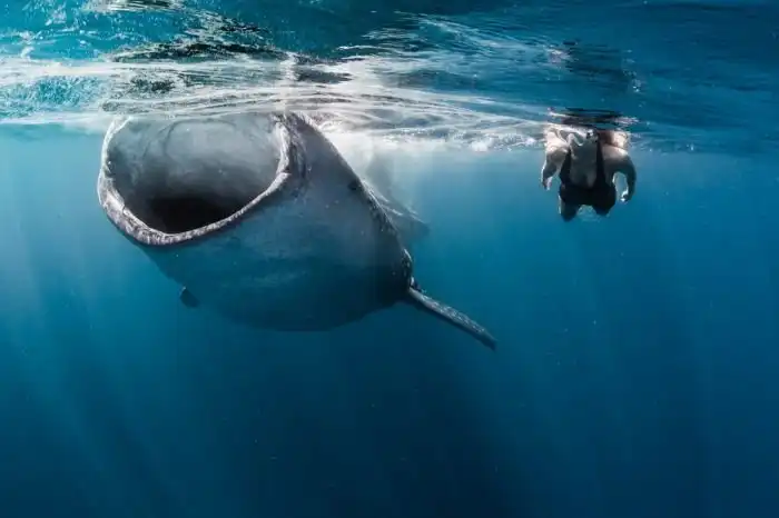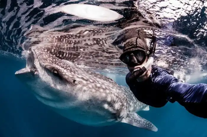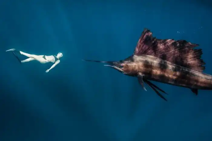 Эта невероятная подводная фотосессия была сделана неподалеку от острова Исла-Мухерес, который находится у Северного полуострова Мексики. Фотомодель Роберта Манчино погрузилась в холодные воды океана в феврале 2014 года, чтобы сделать коллекцию снимков с китовыми акулами, скатами и даже самым быстрым и опасным обитателем океана на планете - рыбой-парусником.