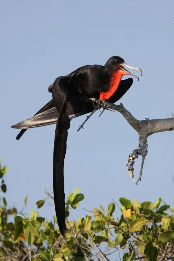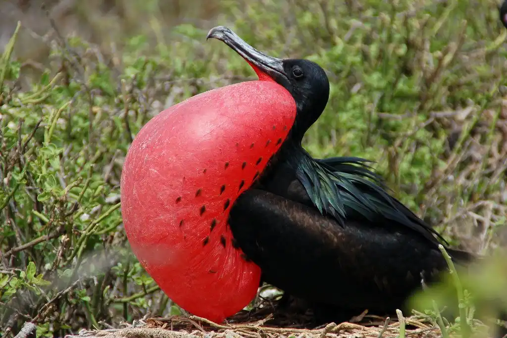 Кроме того, на груди самца есть кожный мешок, который во время брачного периода раздувается до невообразимых размеров и становится ярко красным. Этот аксессуар служит единственной цели – привлечению партнерши. Верхняя часть тела самки фрегата также покрыто черным пером, а грудь и брюхо белые. Молодняк расцветкой оперения схож с самками, только верх у них не черный, а бурый распространены большие фрегаты в тропических водах между 25 градусом северной и 25 градусом южной широты. Всего у этого вида выделяют 5 подвидов, различающихся между собой размерами тела и оттенками в расцветке.Гнездовые колонии располагаются на островах Тихого океана, западной части Атлантического и южной части Индийского океанов. Как правило, на таких островах хищники отсутствуют, что позволяет большим фрегатам устраивать гнезда в кустарниках на высоте 0,5 от земли.