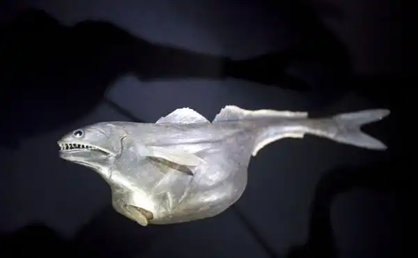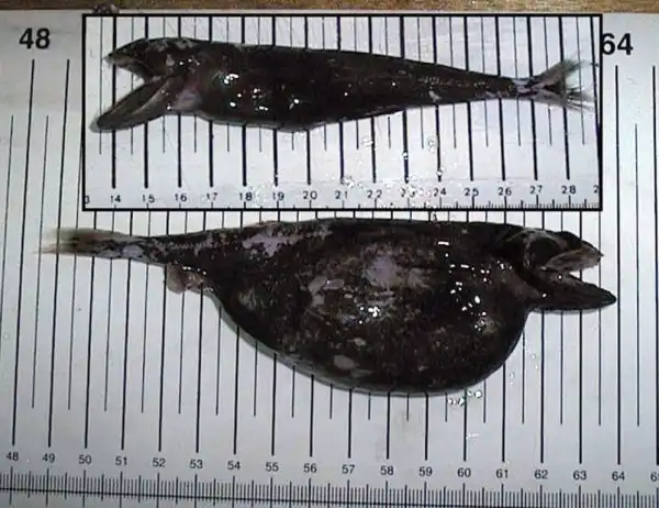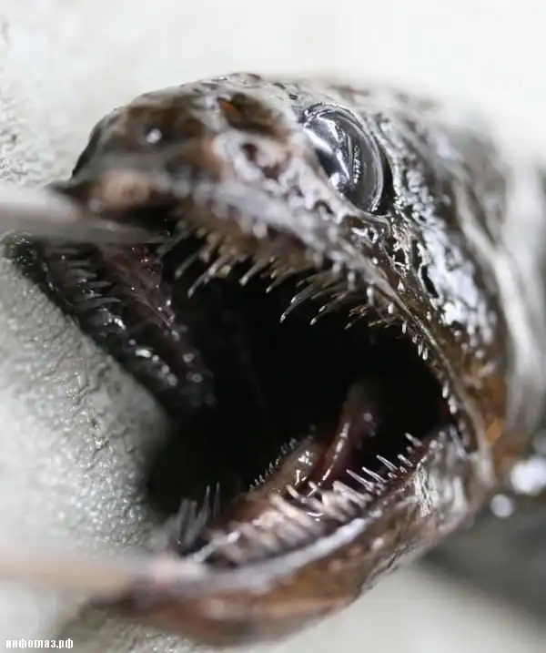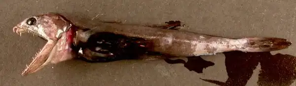 Несмотря на свои хищнические замашки и угрожающее название, длина тела этой рыбы редко превышает 15 сантиметров, некоторые виды могут достигать и 25 сантиметров. Для многих глубоководных рыб характерно удлиненное и сжатое с боков тело, небольшой спинной плавник, отсутствие чешуи и слаборазвитая мускулатура. Наш герой не стал исключением. Характерными особенностями строения его тела являются эластичные кости и огромная пасть, усыпанная подвижными клыковидными зубами.
