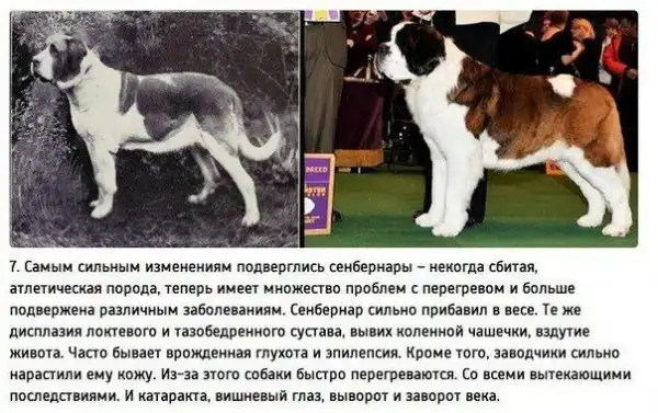 Бытует мнение, что чистокровные выведенные собаки обладают особыми свойствами и в целом выглядят красивее. Но недавно в Интернете появились фотографии из книги 1915 года, В.Е. Масон «Породы всех наций» (Breeds Of All Nations by W. E. Mason), наглядно демонстрирующие, как за последнее столетие изменился вид всем нам известных пород собак. Ясно видно, как вековая селекционная работа по «улучшению» пород пагубно отразилась на внешнем виде и здоровье породистых собак.