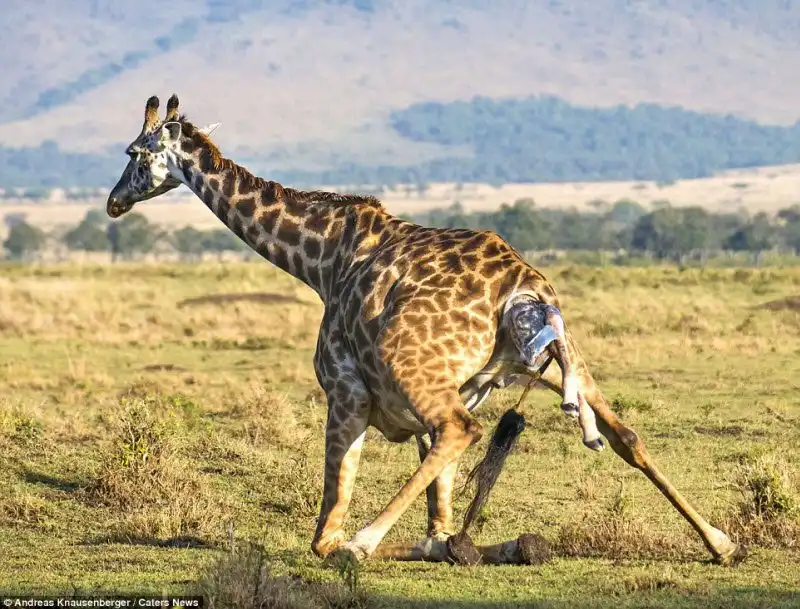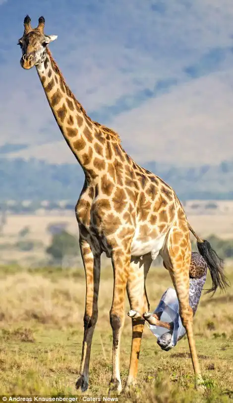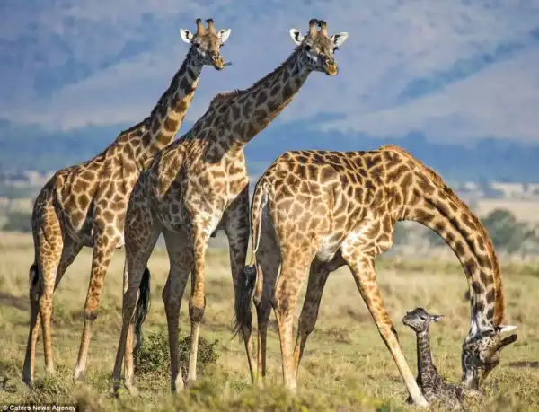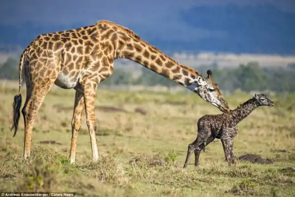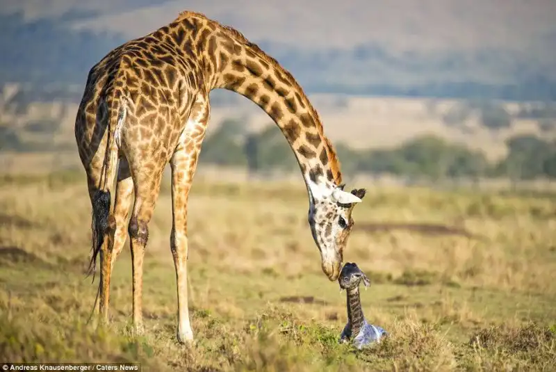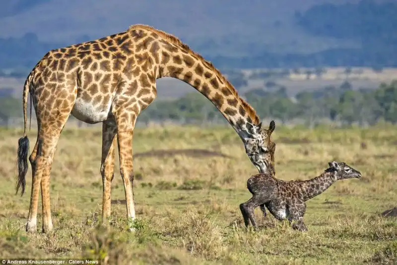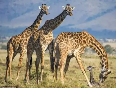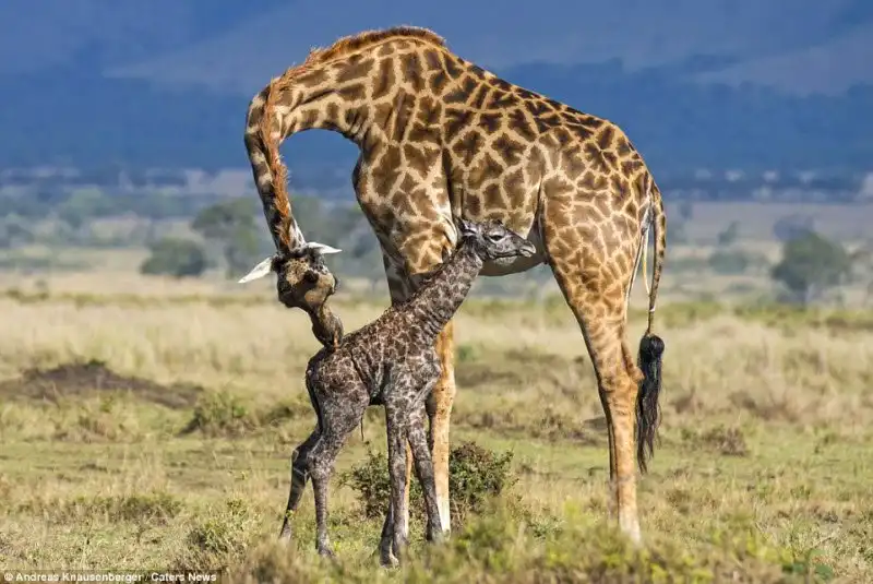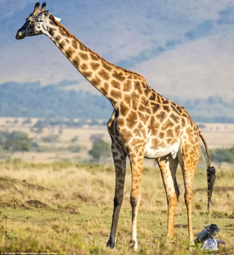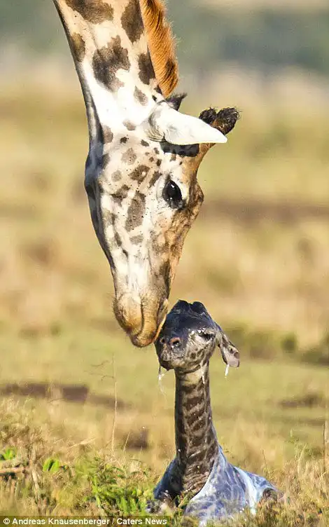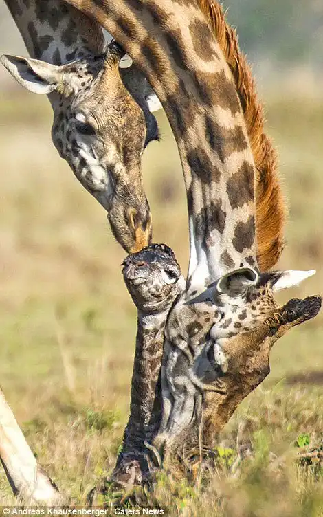 Эти снимки сделал гид Andreas Knausenberger в национальном парке Масаи Мара, в Кении. Двое жирафов стояли и охраняли роженицу от гиен, пока она рожала. Самка вынашивала потомство в течении 15 месяцев, а роды продлились 30 минут.