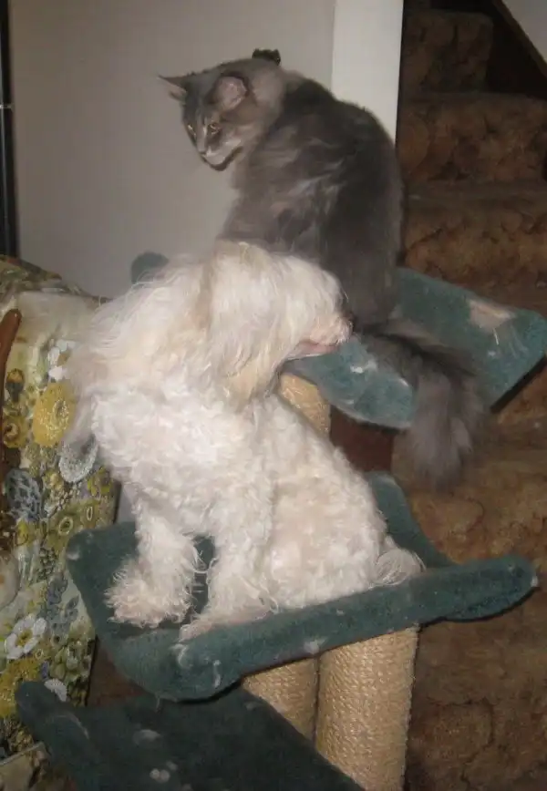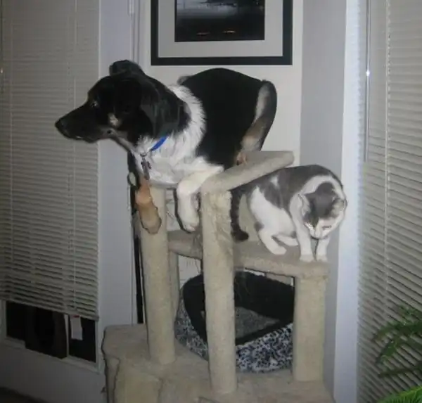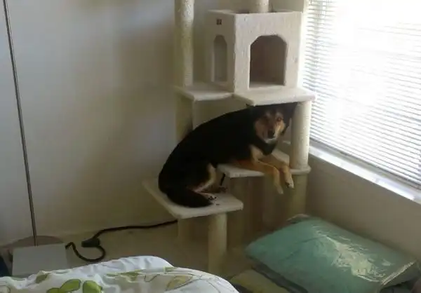 если в доме есть кот и пес, пес обожает все кошачье: еду, игрушки, лазалки разные..