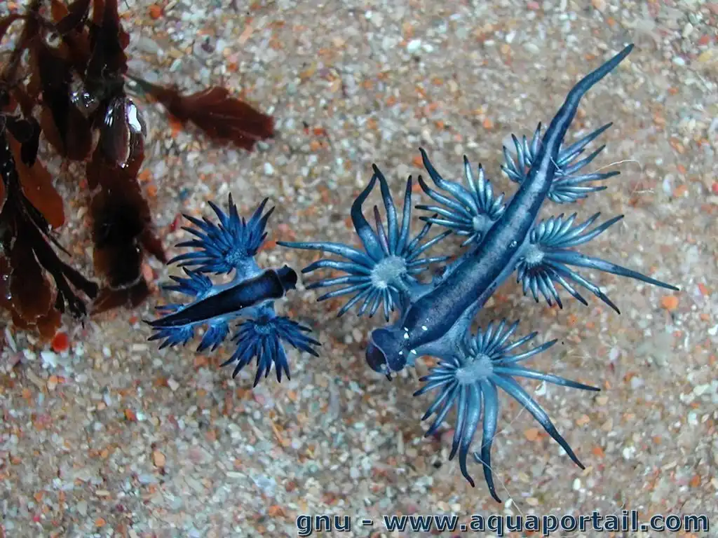 Это Синий Слизень Glaucus из отряда голожаберных моллюсков охотится на другие большие морские организмы в том числе и на опасно ядовитых.